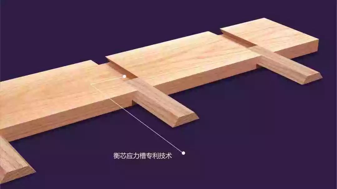 了解了这个原理研发出的衡芯技术,借鉴中国榫卯结构原理,采用同材质的木条以插销的形式安装在长板里,每个长板中有三个插销。因为是同材质的木条,所以能够做到同胀同缩。让每个插销产生分割应力作用,抑制变形,实现小木条起到大作用。